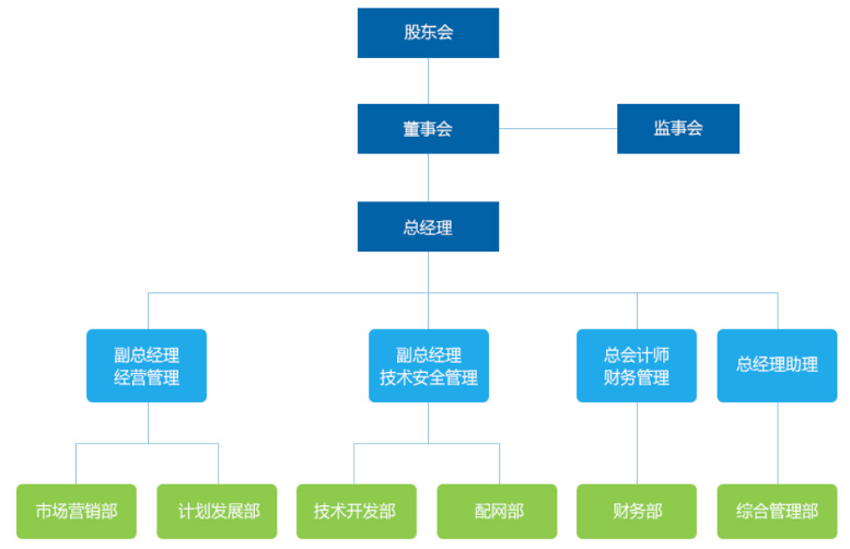 目前,由于业务发展仍在探索阶段,设置综合管理部、财务部、市场营销部、项目管理部。