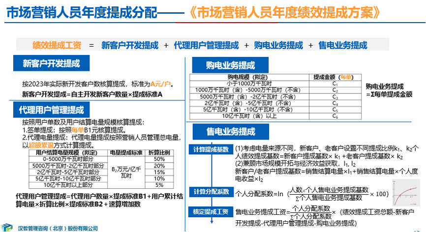 3.设计方案并进行测算,明确市场营销人员提成项目、计算方式;