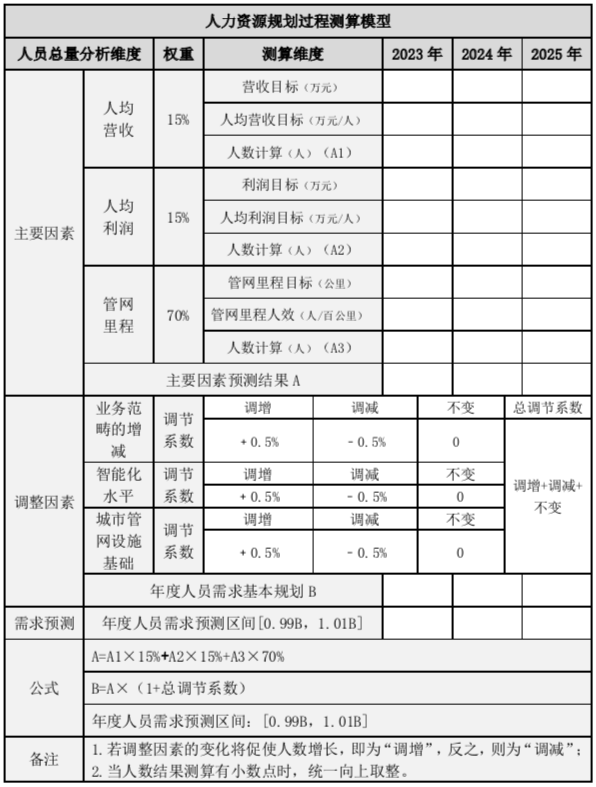 排水公司的人员需求规划模型由三个主要因素和三个调整因素两部分构成。主要因素包括人均营收、人均利润、管网里程;调整因素包括业务范畴的增减、智能化水平、城市管网设施基础。