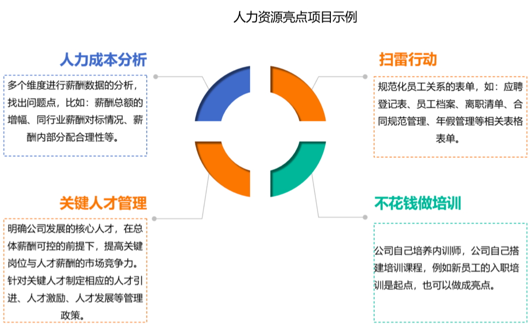 基于人力资源总体目标,明确未来五年内的关键举措与重点工作,组织中高层领导召开人力资源战略解码研讨会,将人力资源战略分解为关键成功因素、具体行动计划,针对性的制定人力资源改进的关键优化举措,从战术层面解决具体问题。可每年以项目为载体做亮点工程,围绕业务需求定制亮点工程,根据项目的运作进行人力资源管理。
