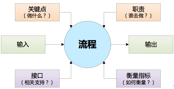 流程不同的定义强调了不同的要点,但归结起来可以发现定义包括了6个要素:具体的输入、特定的输出、若干活动、活动之间关联、服务的客户、创造的价值。