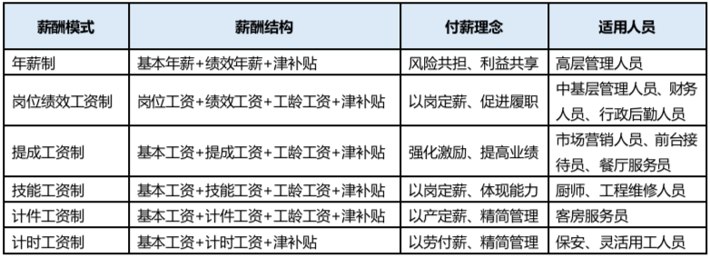 酒店行业岗位类型复杂、激励导向不同,设计薪酬时,也应该结合各类岗位特征、管理要求选择适当的薪酬模式和结构。常见薪酬模式包括年薪制、岗位绩效工资制、提成工资制、技能工资制、计时/计件工资制等。