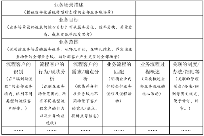 为有效构建数字化平台的转型模型,从数字化系统支撑的全部业务域,或与外部客户产生交互的全部业务场景出发,识别出该业务域内的“端到端流程”。再以“端到端流程”为客户创造价值、高效实现业务目标为导向,结合客户需求及客户触点中流程运行的问题开展流程优化,驱动数字化平台转型的支撑,从而解决业务问题,或达成业务目标。