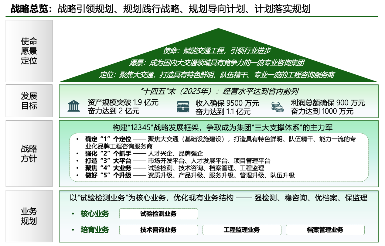 公司将以“12345”总体发展为引领,切实践行“赋能交通工程,引领行业进步”使命担当,确定“1”个定位——聚焦大交通(基础设施建设),打造具有特色鲜明、队伍精干、能力一流的专业化品牌工程咨询服务商;强化“2”个抓手——人才兴企和品牌强企;打造“3”大平台——市场开发平台、人才发展平台、项目管理平台;聚焦“4”大业务——试验检测、技术咨询、档案管理、工程监理;做好“5”个升级——资质升级、产品升级、服务升级、管理升级、队伍升级。