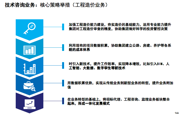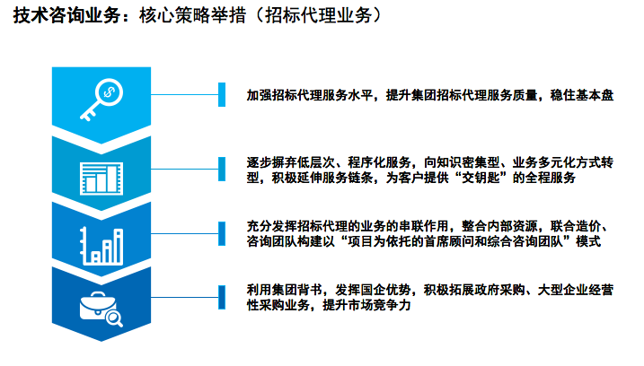项目组通过对试验检测、工程咨询、工程监理、档案管理四大业务领域深入分析和研究,结合工程咨询业务现状及集团内部资源状况,对各项业务提出明确的功能定位、发展目标及发展路径,解决公司各项业务的总体定位和布局,以及“十四五”未来2年的增长路径。