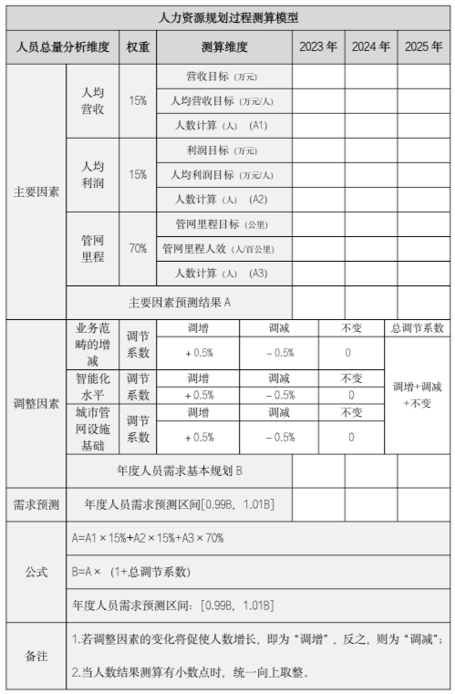 公司的人员需求规划模型由三个主要因素和三个调整因素两部分构成。主要因素包括人均营收、人均利润、管网里程;调整因素包括业务范畴的增减、智能化水平、城市管网设施基础。