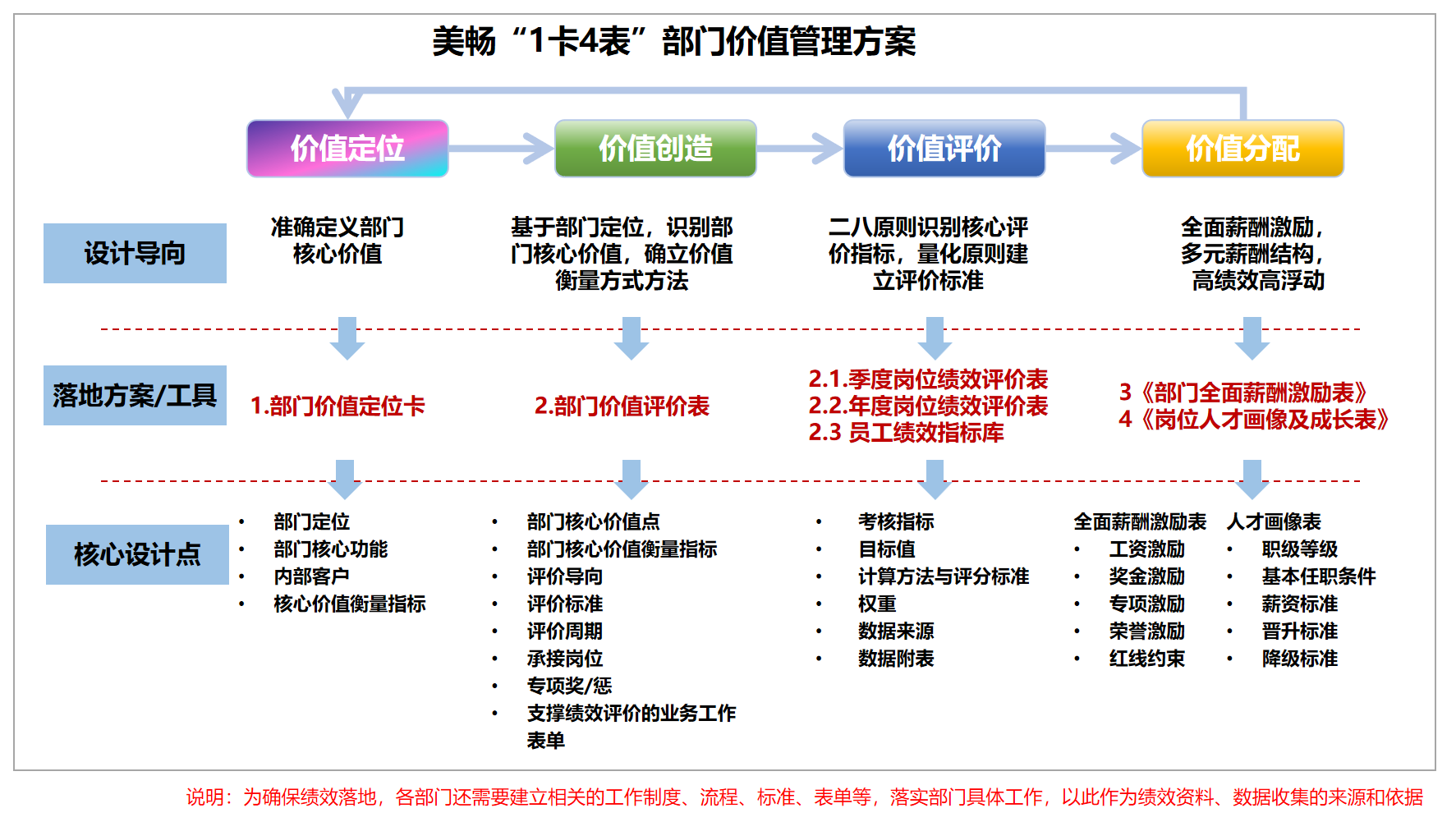 1、设计开发《部门价值定位卡》《部门价值评价表》《部门绩效考核表》解决对部门价值的分析和梳理,提炼形成核心的、可量化的、可衡量的部门价值评价方案。