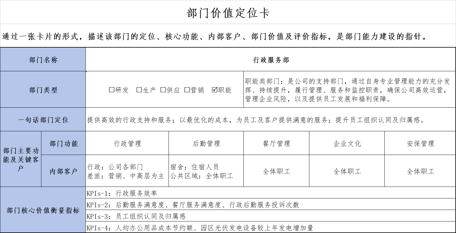 1、建立部门价值管理体系,重点是职能部门的价值定位和价值评价,解决职能部门有效评价的问题。