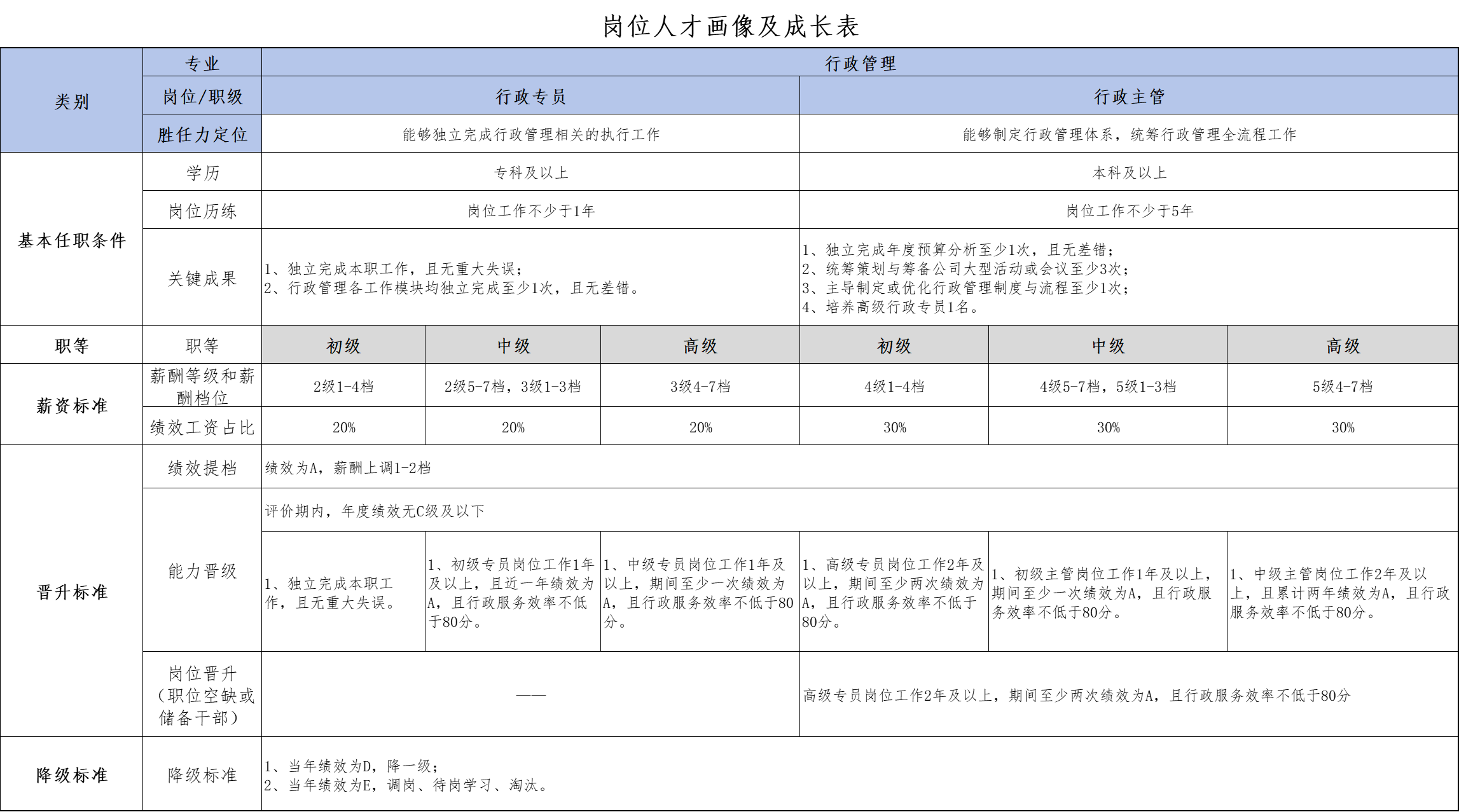 2、设计开发《员工画像及成长表》各对岗位不同层级的角色定位、晋升和降级标准、考核指标、薪酬待遇范围等,方案简洁清晰,“一站式”解决部门对员工评价标准和成长激励的问题。