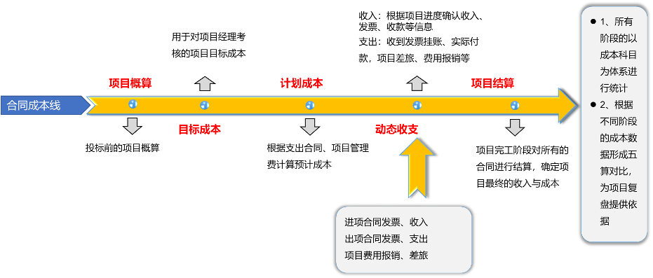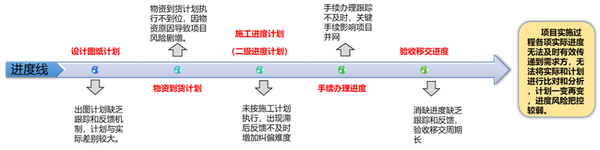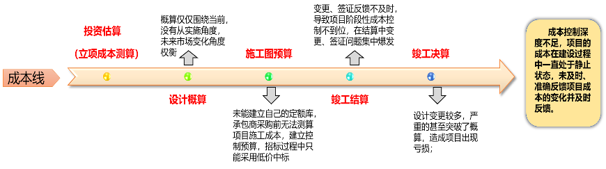 经过调研,该公司成本管理和进度管理是项目实施管控的重点和薄弱点,图5-2-2、5-2-3分别是我们梳理该公司成本线和进度线发现的问题点。