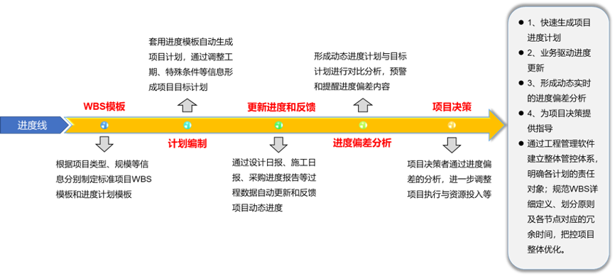 对于进度的管控,主要在计划编制、进度数据收集和分析、计划调整几个环节,企业在计划编制环节主要是WBS编制不规范,所以增加了WBS模板应用环节,同时在进度数据收集和分析方面做的不到位,我们主要措施就是设置规范并能在后续系统中自动提取数据的项目日报模板。