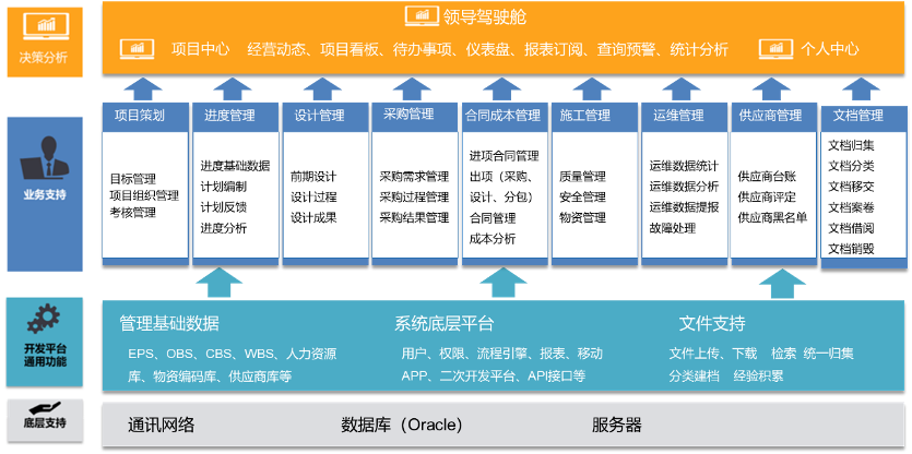 通过流程系统的集成,信息系统能够全方位监控项目经营管理数据,并进行智能分析平台;以工程项目为主体,监控分析项目关键数据、关键指标,形成进度的有效统计、问题的有效预警,并进行智能的分析,为管理决策提供数据支撑,有效的降低问题发生的风险。