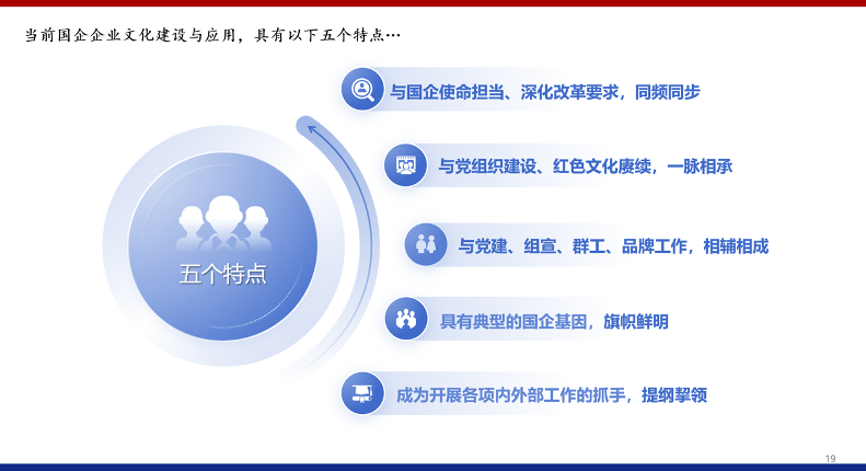 在“企业文化为什么”篇章,段磊博士系统介绍了企业文化的起源、发展、知名企业家/实学家对文化的经典论述;在“企业文化为什么”篇章,段磊博士以习总书记语录“文化自信是更基础、更广泛、更深厚的自信,是更基本、更深沉、更持久的力量”开篇,系统介绍了国内外对于企业文化作用机理的研究成果;在“国有企业文化建设特点”部分,系统分析、归纳了当前国企文化建设的20字特点(如下图);