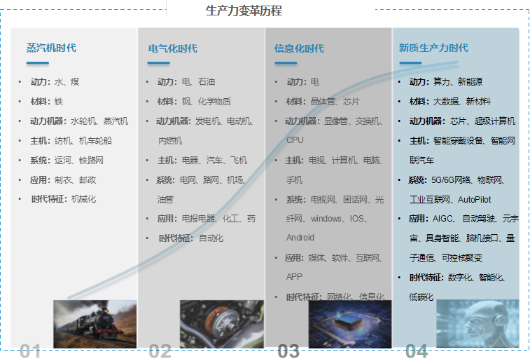人类社会发展历经四次科技革命,跨越蒸汽机时代、电气化时代和信息化时代,来到“智能化和绿色化”的新质生产力时代。相较于传统生产力,新质生产力具有数字化、创新驱动、绿色化和全球协同四个特征,是以智能技术和绿色技术为代表的新一轮技术革命引致的生产力跃迁。