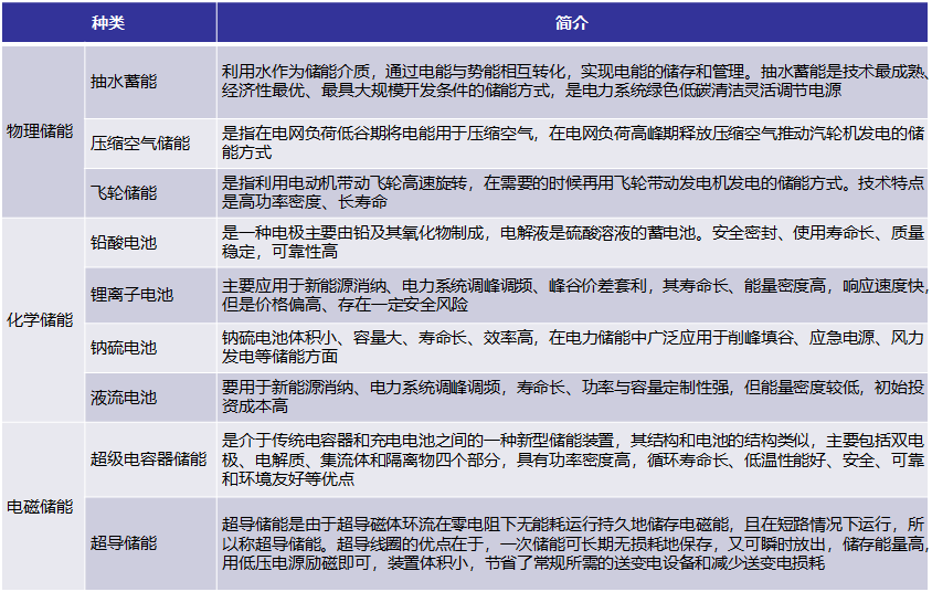 储能即能量的存储,指通过某种介质或设备,将一种形式的能量转化成另一种较为稳定的能量形式并存储,在需要时以特定能量形式释放出来的一系列技术和措施。按照能量储存方式,储能可分为物理储能、化学储能、电磁储能三类,其中物理储能主要包括抽水蓄能、压缩空气储能、飞轮储能等,化学储能主要包括铅酸电池、锂离子电池、钠硫电池、液流电池等,电磁储能主要包括超级电容器储能、超导储能。