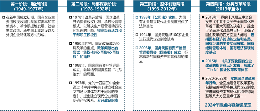 2013年,党的十八届三中全会发布《中共中央关于全面深化改革若干重大问题的决定》,提出了全面深化改革总目标,明确了国企改革的四方面重大问题,包括国有经济的功能定位和布局、国有经济的主要实现形式、国有经济管理体制、国有经济微观制度基础。2015年,《关于深化国有企业改革的指导意见》发布,逐步形成了“1+N”国企改革政策体系。2020-2022年,实施国企改革三年行动,全面推进各项改革落地,包括完善中国特色现代企业制度、推进国有资本布局优化和结构调整等八大方面重点任务。
