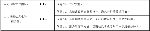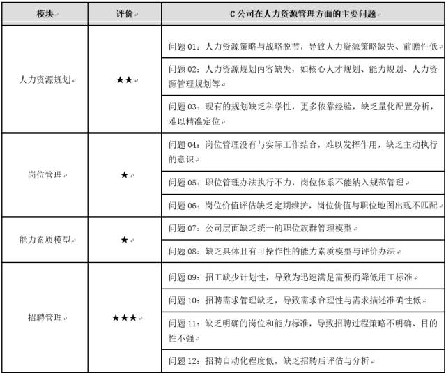 根源四:现代大型企业的人力资源管理,必须依靠信息平台的支持,通过信息技术的使用,固化流程,提高效率,实现组织的专业化、扁平化,而C公司虽然引入了高端的信息化软件,但还没有得到系统的应用,导致人力资源管理的主要工作还停留在文本阶段,人力资源管理不得不配备大量的人员,管理方法各异,执行难度加大。