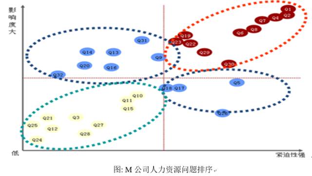 采用“影响度-紧迫性矩阵”,可把上述32个问题分成四个区间,其中,红色的问题是影响度、紧迫性都比较大的,是需要首先解决的。
