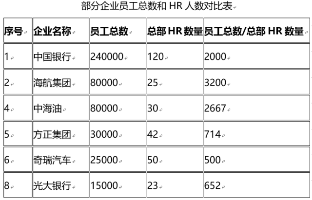 随着企业员工总数的增加,每个HR人员服务的员工数应该呈上升趋势,且企业规模越大,上升趋势应更为明显。据有关研究显示,HR人员和企业员工总数之间的比例有一定的标准,下表列举了部分企业的实例。