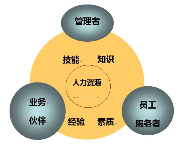 如图所示,在HR/314 模型中,“3”是指人力资源经理的三种角色,即:管理者、业务伙伴、员工服务者;“1”是指一个理念,即:人力资源管理理念;“4”是指四个胜任维度,即:技能、知识、经验、素质。
