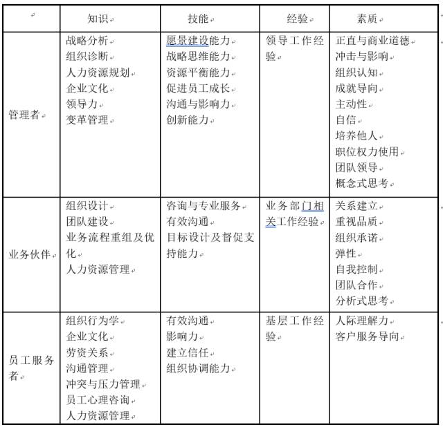 (3)所谓“四个胜任维度”。我们把人力资源经理的胜任维度归纳为:知识、技能、经验、素质。其中,知识是人力资源经理作为人事管理专家的基本要求;而人力资源管理又是具有很强实践性的工作,对于经验、技能的要求同样重要;素质是隐形的,但素质往往决定了一个人能不能干好这项工作,在对人的工作中,素质是需要关注的重要潜质。