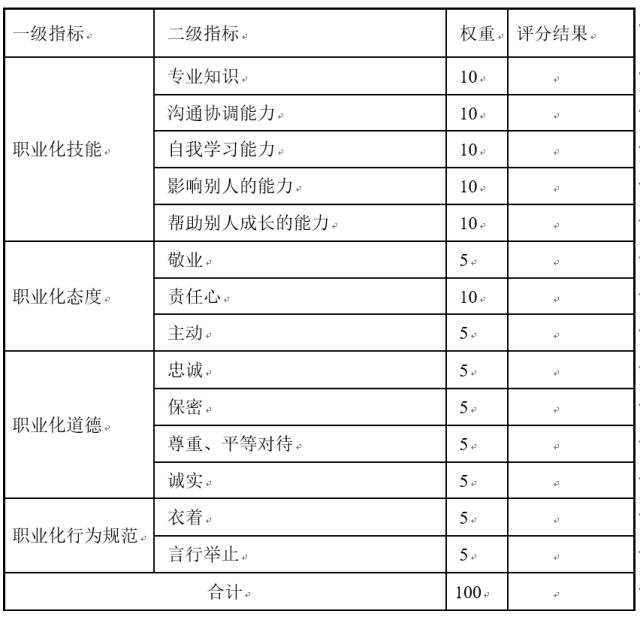 根据职业化的内涵,我们为企业的人力资源管理者初步确定了职业化技能、职业化态度、职业化道德和职业化行为规范四个一级评价维度,在此基础上,开发了针对HRM的二级评价指标,并赋予了相应的权重,如下表所示: