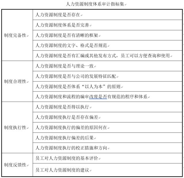 结合前文分析,为了对人力资源制度的完备性、合理性、执行性、反馈性进行审计,我们总结出提出了“人力资源制度体系审计指标集“,如下表所示: