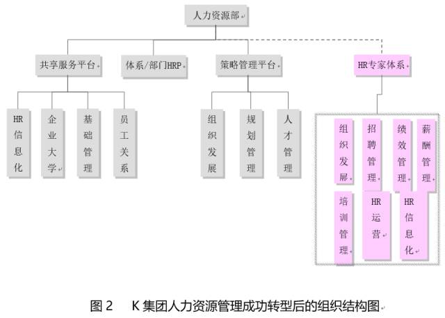 在这个组织结构图中,保留了K集团人力资源管理的三级架构,明确了总部人力资源作为共享服务平台、策略管理平台、HR专家体系的三大目标。
