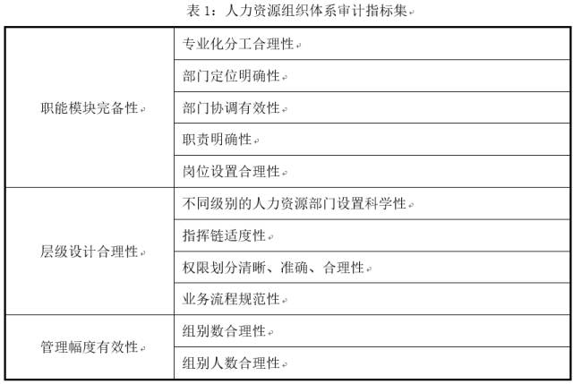 每一种人力资源组织体系都是在特定的外部环境影响下产生的,组织形态本身并不存在优劣之分,适合的,才是最好的。由此,从审计的角度,我们需要三个方面,一是职能模块的完备性,二是层次设计的合理性,三是管理幅度的有效性。结合前文分析,我们建立了有关于人力资源组织体系的审计指标集,如下表所示: