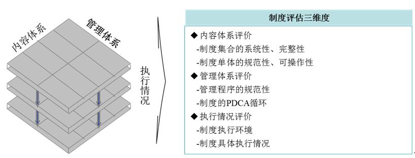 制度的核心包括内容体系、管理体系和执行情况三个维度,制度评估也应与此相对应,由此我们提出了“制度评估度三维模型”,如图所示: