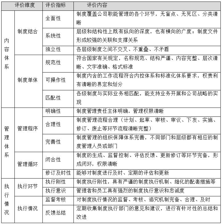 F集团成立于2004年,是地方政府注资成立的国有投资公司,负责当地燃气、热力、水务、公共交通等事业的发展与建设,成立近十年来,公司先后投资成立和并购了二十余家企业,为了提高上述企业的管理水平,集团拟对以下企业的制度管理情况进行一次全面、系统的检查和评估。为此,集团决定,首先由综合管理部牵头,建立一个制度评价体系,并组织评价小组,对下属企业的制度建设情况开展评价,在此基础上,再决定后续的制度建设与提升工作。