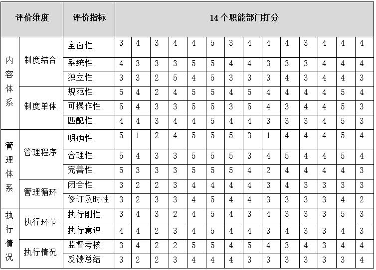 (2) 由综合管理部牵头,组织集团各职能部门负责人,针对各下属企业制度管理情况进行评估和打分。其中,十四个职能部门,每个部分派一名领导或代表参与打分,评分标准按1-5分,从低到高,1分代表最差,5分代表最好。
