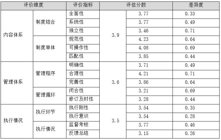 单项指标得分总和的平均数作为最终得分。分值越高,说明对现有制度体系的总体认可度越高。单项指标的分值方差代表评价差异度,差异度越高,表明内部对同一指标的意见差异越大。超过一定偏差,需要重新进行打分。