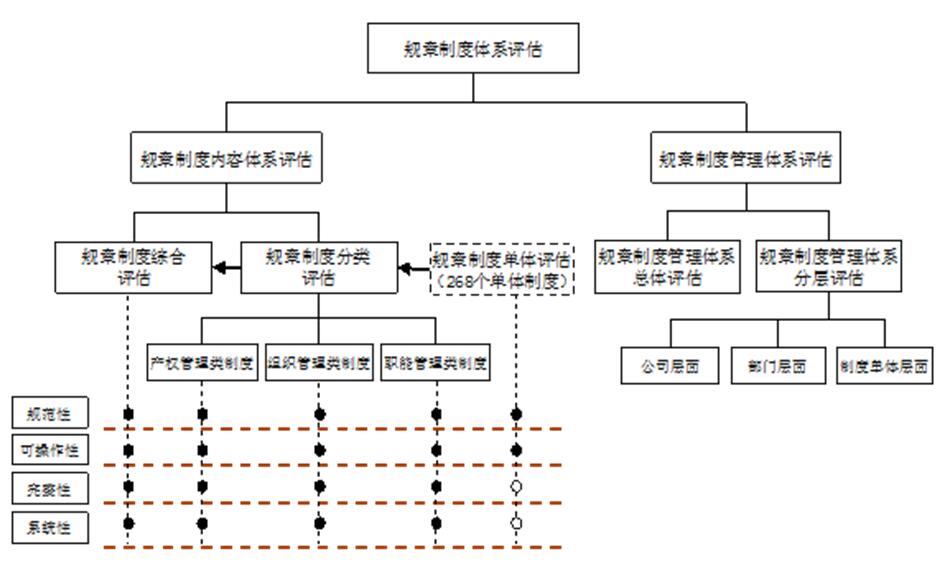 对规章制度内容的评估,分为单体评估、分类评估和综合评估三个层次开展,后两个评估都是建立在单体评估的基础之上。其中: