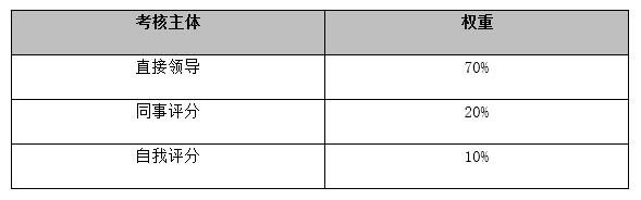 由于直接主管对职工的工作最为了解,因此直接主管的评分占到职工绩效的70%,由于同事之间接触时间比较长,为了更好地促成工作配合,因此同事评分占到了20%,绩效考核的目的是为了进一步提升职工的工作成果,为了提升职工对绩效考核的参与度,实现职工与直接上级之间的良好沟通,设计了10%的自我评分权重。