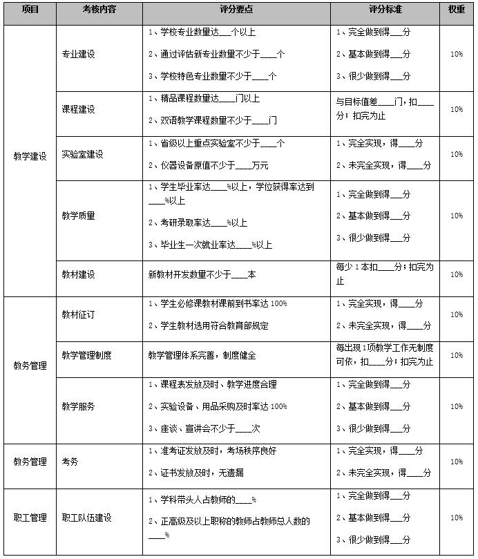 关键绩效指标:师资情况、学科建设、招生计划完成率、毕业生就业率、科研成果、科研基地数量、学院荣誉。