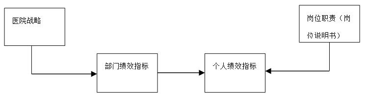 (1)源于医院战略或者部门目标。医院战略目标是各部门、科室工作的初衷,因此建立服务于战略的绩效考核指标体系,是战略目标的重要实现工具。医院通过制定自身长期的战略目标,制定出本年度具体的发展计划和业务工作重点,形成医院级的关键绩效指标,然后分解成明确的科室级关键绩效指标,部门管理者围绕本部门的业务重点目标,并根据下属职务应负责的工作,将部门目标层层分解到具体责任人。个人绩效指标是对医院战略目标的进一步细化和拓展。