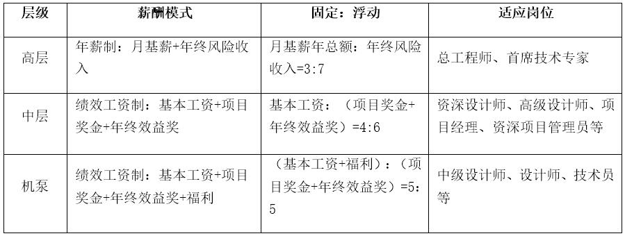 根据管理层级高低与承担的责任轻重,薪酬收入中的固定部分(基本工资)和浮动工资(项目奖金、年终效益奖)的分配比例进行不同设置: