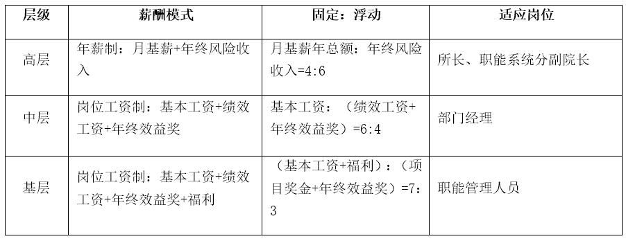 根据职能人员的管理层级不同,薪酬收入中的固定部分(基本工资)和浮动工资(绩效工资、年终效益奖)的分配比例进行不同设置: