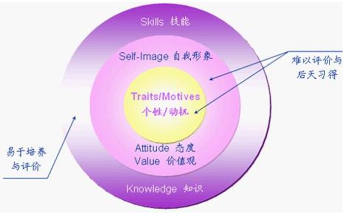 在素质洋葱模型中,知识、技能等外层要素易于培养和评价,而个性和动机等内层要素则难以评价与后天习得。