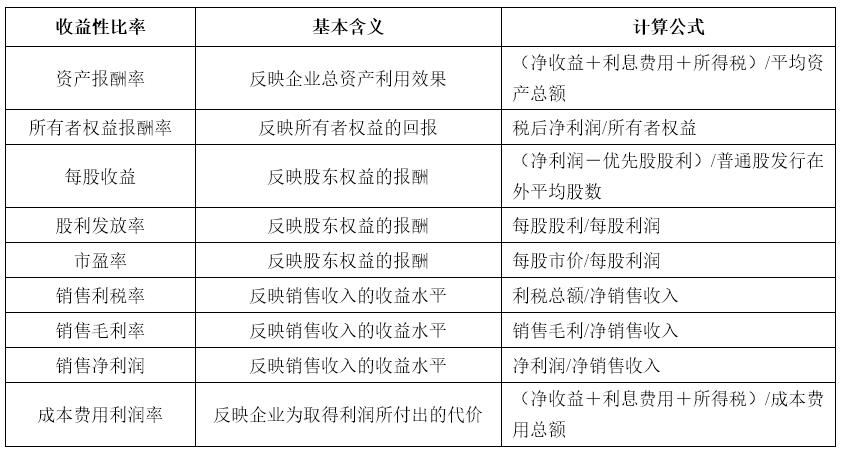 收益性指标分析的目的是观察企业一定时期内的收益及获利能力,其主要指标的含义及计算公式如表1所示。