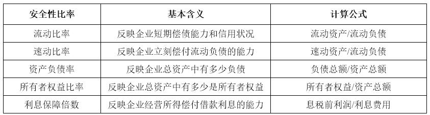 安全性指标是指企业经营的安全程度,即资金调度的安全性,分析安全性指标的目的在于观察企业一定时期内的偿债能力,其主要指标的含义及计算公式如表2所示。