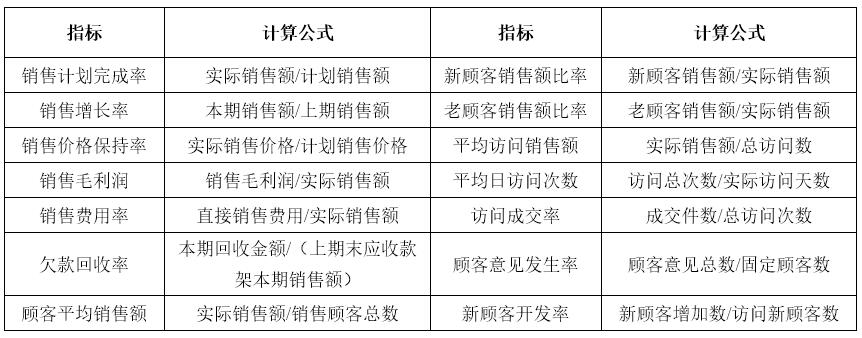 销售绩效分析主要分析销售计划完成率、地区发展状况以及销售活动效率等内容,主要指标及计算公式如表1所示。