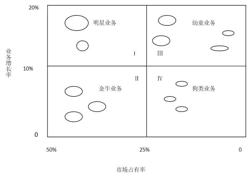 第I象限: 明星业务。该业务市场占有率和业务增长率均高,对该产品宜采取扩张战略,进行必要的投资,维持其有利的竞争地位。