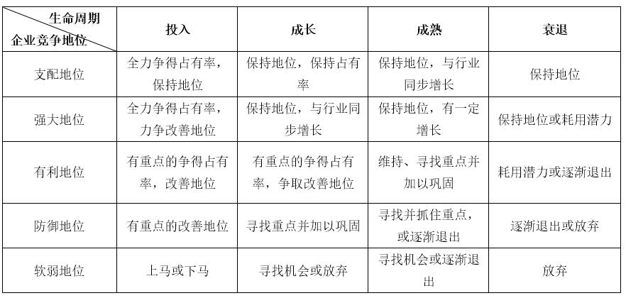 以行业生命周期为横坐标,企业竞争地位为纵坐标,就组成一个具有20个单元的生命周期矩阵,有四种战略选择,即发展战略、重点发展战略、调整战略与退出战略。在何种情况下采取哪一种策略可参考下表生命周期战略分析: