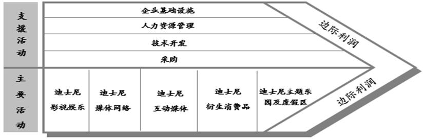 迪士尼公司成功地打造了一条“电影—电视电台—衍生品—迪士尼乐园”的产业价值链,迪士尼影视娱乐、迪士尼媒体网络、迪士尼互动媒体、迪士尼主题乐园度假区与迪士尼消费品等部门分别负责产业链条不同环节的业务拓展和管理,形成了从唐老鸭、米老鼠等经典影视节目到迪士尼游乐园、迪士尼系列图书、迪士尼玩具、迪士尼服饰与箱包的、全球最长的版权价值链。